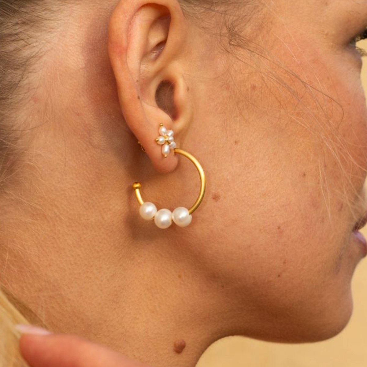 Hver ørering er prydet med funklende ferskvandsperler, der tilfører et naturligt og luksuriøst præg. Med deres lette design kan de bæres hele dagen uden ubehag, og den gyldne eller sølvfarvede tone komplementerer enhver stil. Øreringenes tidsløse design gør, at de nemt kan kombineres med andre øreringe for et personligt smykkelook.