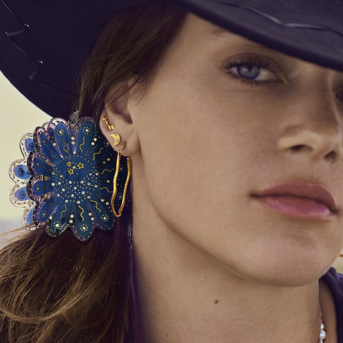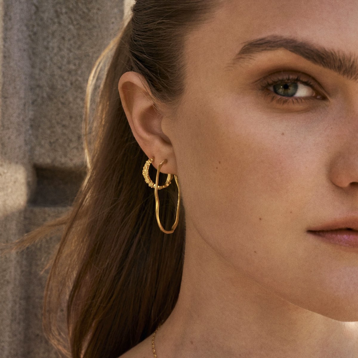 Et twistet design med skinnende zirkoner nyfortolker den klassiske hoop-ørering. Echo-øreringene findes i tre forskellige størrelser og er i Maanestens A/W 23-kollektion skabt som en hyldest til naturens organiske former, en af kollektionens store inspirationskilder.