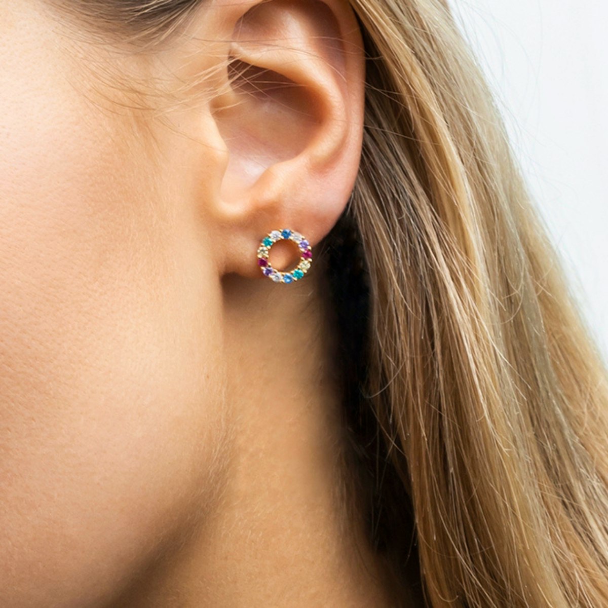 Disse smukke øreringe fra Sif Jakobs kombinerer elegance og livlige farver i et moderne design. Fremstillet i 925 sterlingsølv og forgyldt med 18 karat guld, har de en blankpoleret overflade, der reflekterer lyset på smukkeste vis. Øreringene er prydet med facetslebne multifarvede zirkoner, der tilføjer et farverigt og livligt element til dit look.