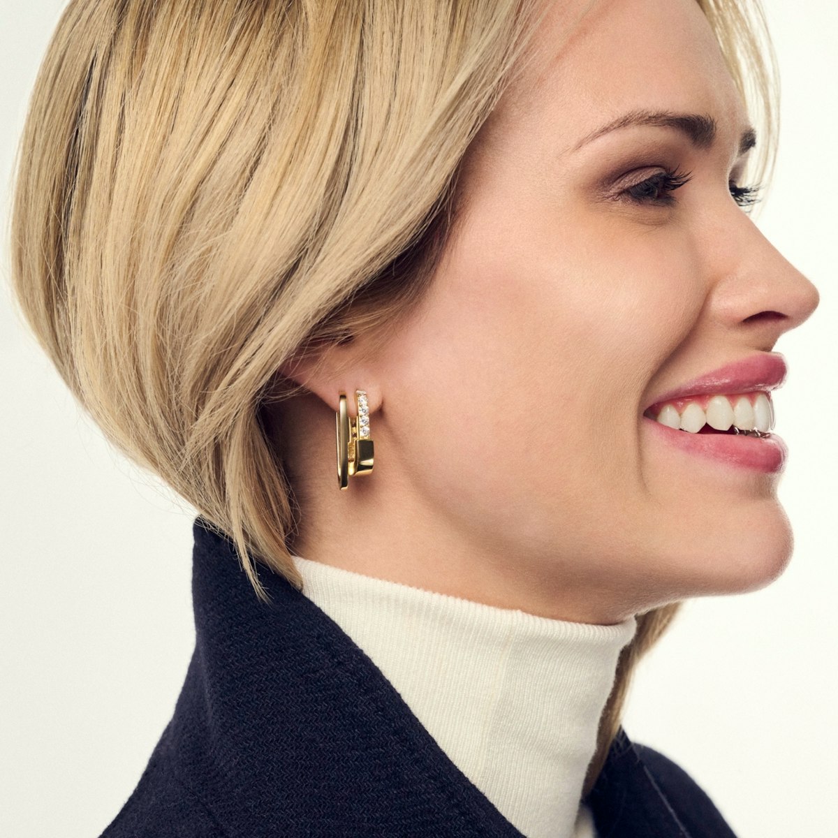 Ta sama biżuteria jest również dostępna w pozłacanym 18-karatowym złotem srebrze próby 925, gdzie polerowana powierzchnia i ręcznie osadzane fasetowane białe cyrkonie tworzą luksusowy i promienny design. Przy identycznych wymiarach - długość 23,5 mm, szerokość 5 mm i grubość 3 mm - zachowują ten sam elegancki i klasyczny wygląd, który może rozjaśnić każdą stylizację.