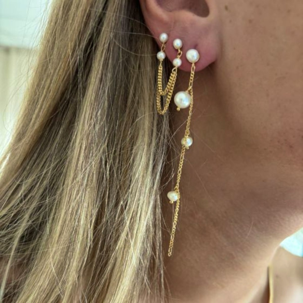 Jedna biżuteria - dwie ekspresje! Ten wyjątkowy kolczyk z perłą od STINE A Jewelry daje poczucie noszenia dwóch kolczyków w jednym projekcie. Kolczyk składa się z dwóch oddzielnych sztyftów z pozłacanego 18-karatowym złotem srebra próby 925, każdy z okrągłą, błyszczącą perłą słodkowodną. Oba sztyfty są pięknie połączone dwoma cienkimi łańcuszkami ozdobionymi drobnymi perłami, które dodają ruchu, życia i artystycznego charakteru Twojemu wyglądowi.